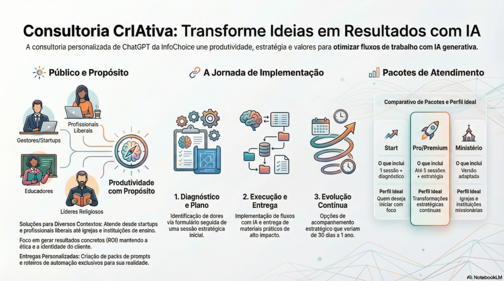 Em uma era marcada por velocidade, sobrecarga de informações e mudanças constantes, a Inteligência Artificial generativa — especialmente com o ChatGPT — surge como uma aliada poderosa para empresas, profissionais e instituições. A Consultoria CrIAtiva Personalizada com ChatGPT oferece soluções sob medida para transformar ideias em resultados, com foco em produtividade, inteligência estratégica e propósito.