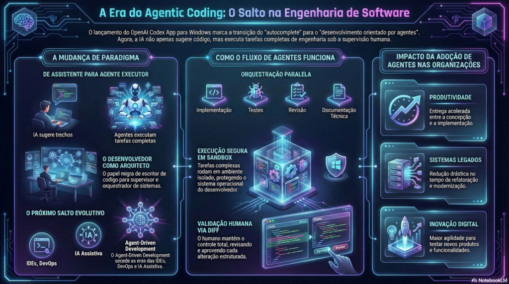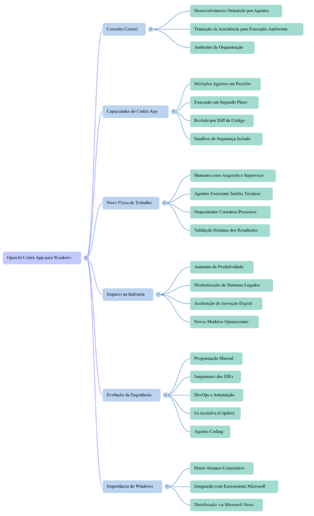 Agora, com o lançamento do aplicativo desktop, o Codex passa a funcionar como um ambiente de orquestração de agentes de desenvolvimento, onde múltiplos processos de engenharia de software podem ser executados simultaneamente.